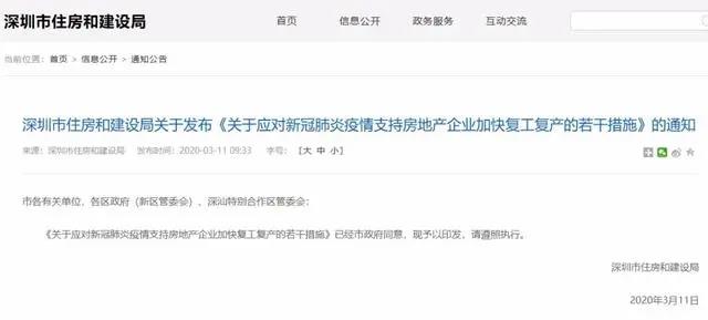 3月11日上午,深圳市住房和建设局关于发布《关于应对新冠肺炎疫情支持房地产企业加快复工复产的若干措施》。