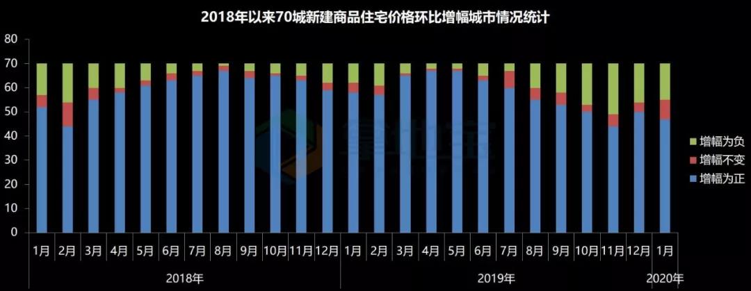 2020年1月,全国70个大中城市中,新建商品住宅价格环比上涨的城市47个,比上月减少3个,进一步遏制房价上涨。其中,环比涨幅超过2%的没有,环比涨幅在1.1%~2%之间的的有4个,其他43个城市环比涨幅在0.1~1%之间。